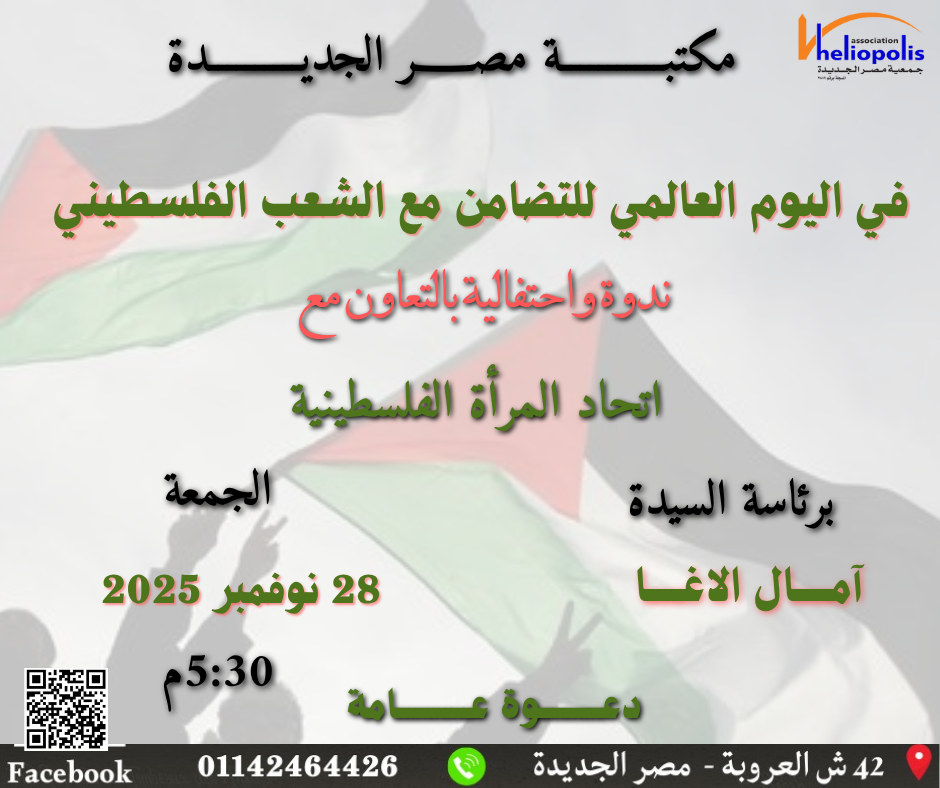 الجمعة 28 نوفمبر 2025الوقت: 5:30 مساءًالفعالية: ندوة واحتفالية بمناسبة اليوم العالمي للتضامن