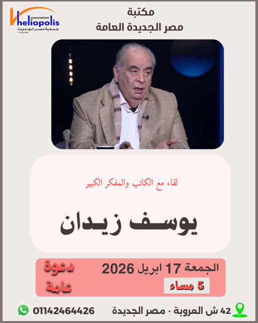 الساعة 5:00 مساءً لقاء مع المفكر الكبير يوسف زيدان ومناقشة احدث اعماله دعوة عامة