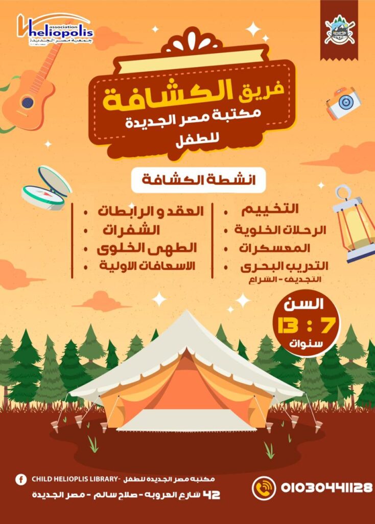 هي ميدان إكتشاف الذات وساحة الاعتماد على النفس و إبراز المواهب و الابداع بأبسط الأدوات لذلك نجد إن الحبل و الاخشاب و الطبيعة هي رفيقة الدرب لكل كشاف ⚜ دورة الكشافة بمكتبة مصر الجديدة للطفل |